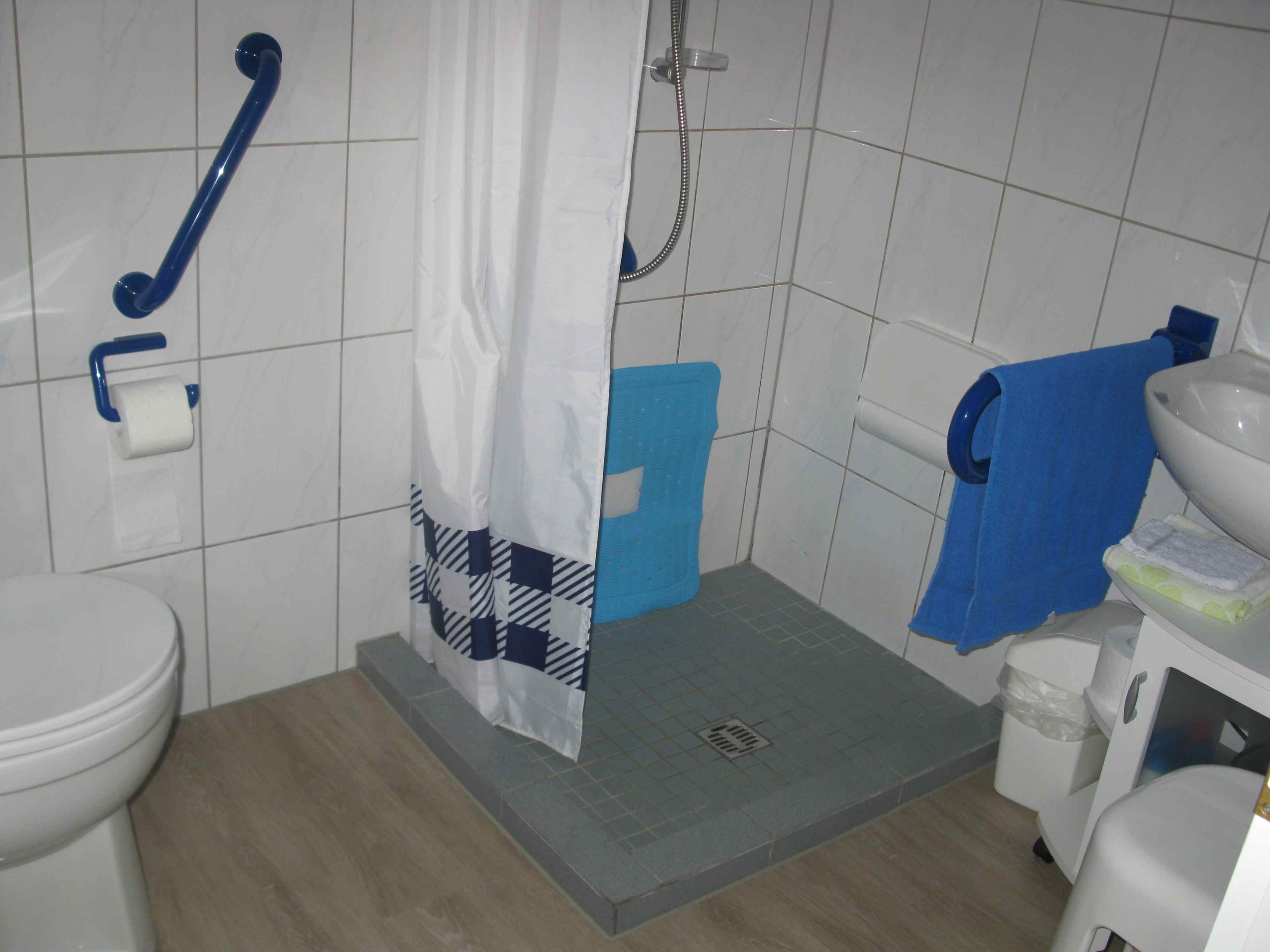 Darüber hinaus gibt es in der Ferienwohnung ein behindertengerechtes Bad mit Dusche.