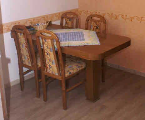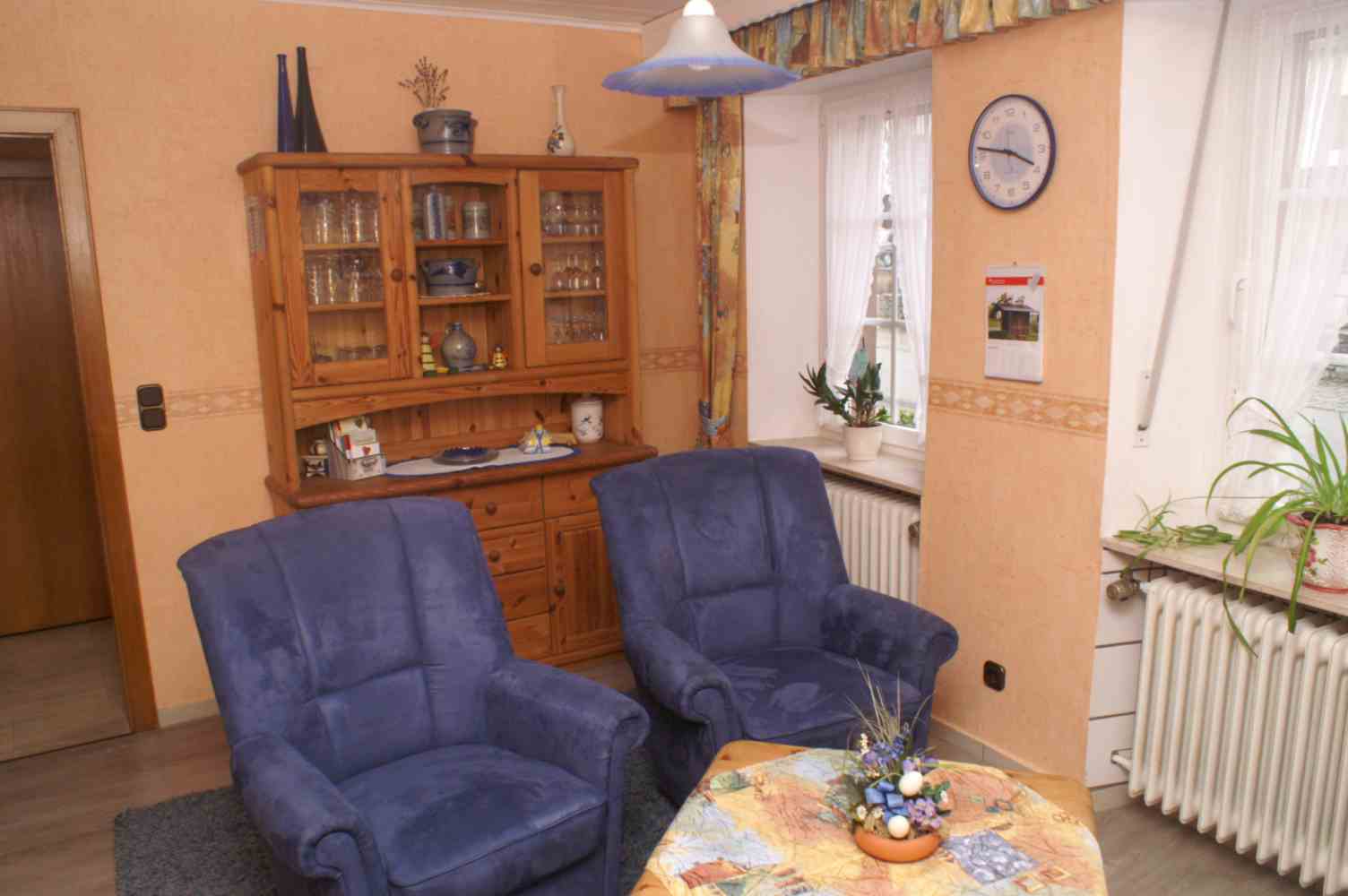 angrenzend und über einen breitem Durchgang verbunden, befindet sich eine kleine Essecke sowie eine geräumige Einbauküche.