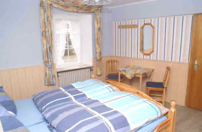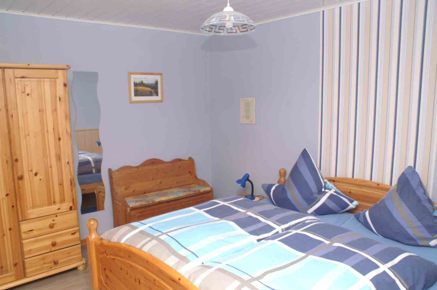 Besonderen Komfort bietet das große Schlafzimmer mit Doppelbett, Kleiderschrank und kleiner Sitzgruppe.