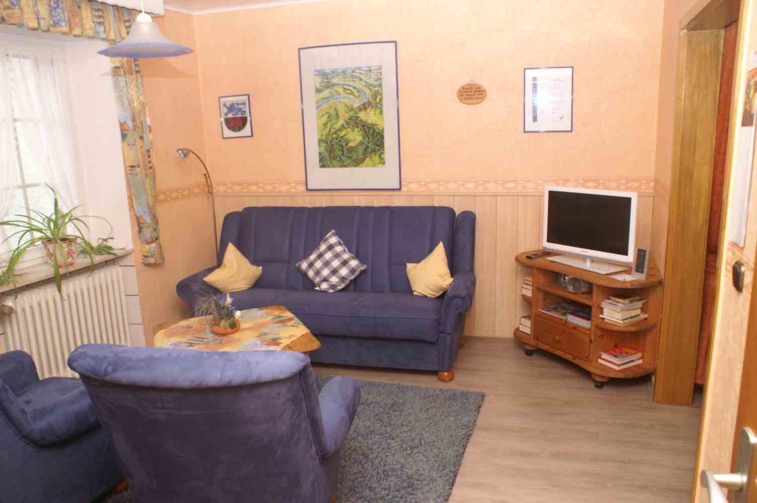 Im Wohnbereich gibt es eine kleine Musikanlage mit modernem Fernsehgerät und Satellitenempfang.